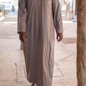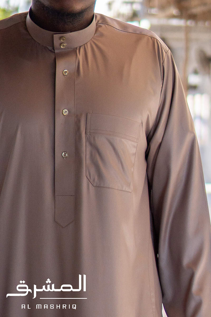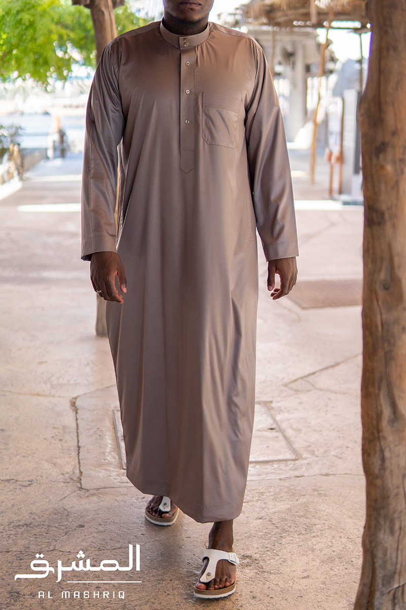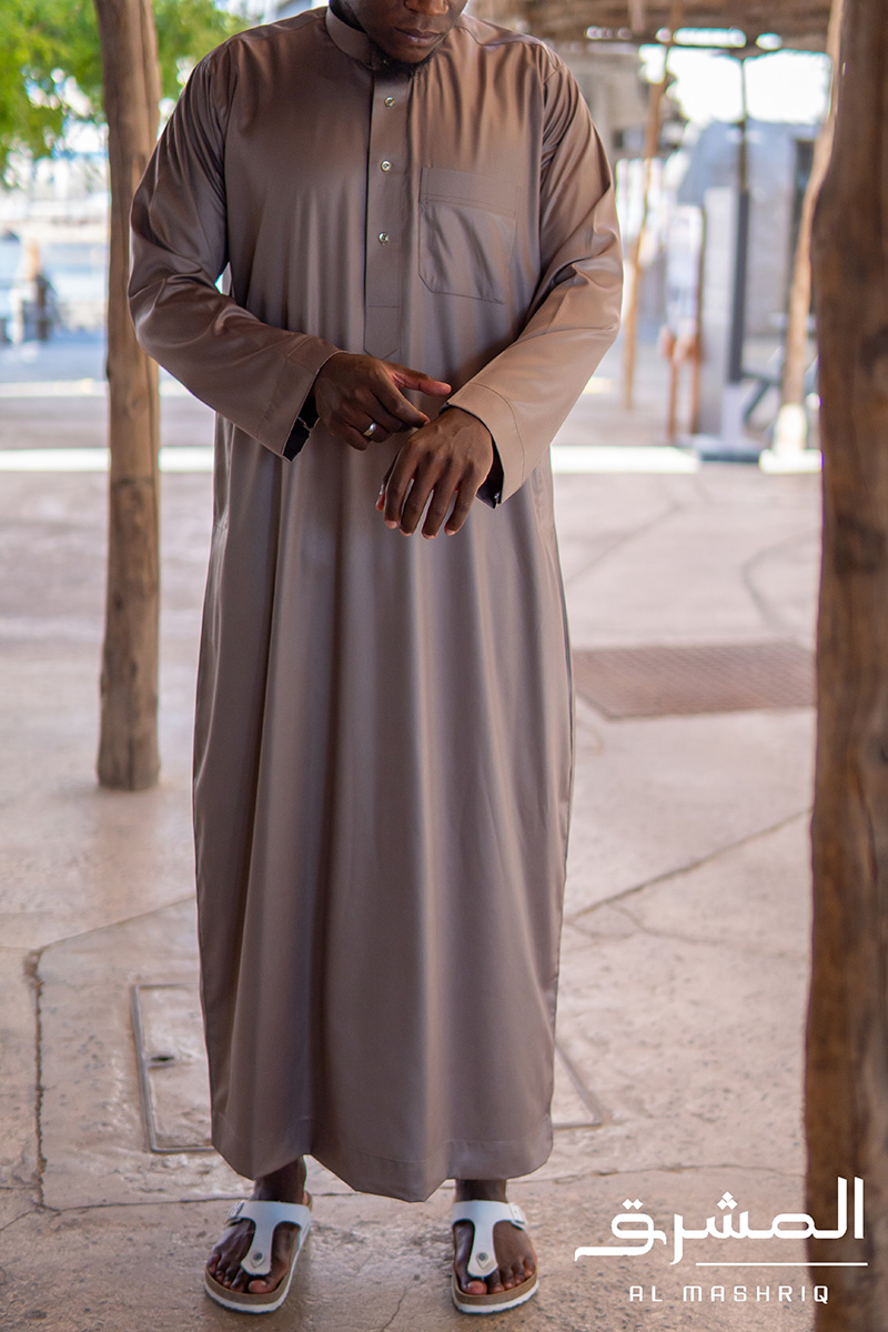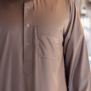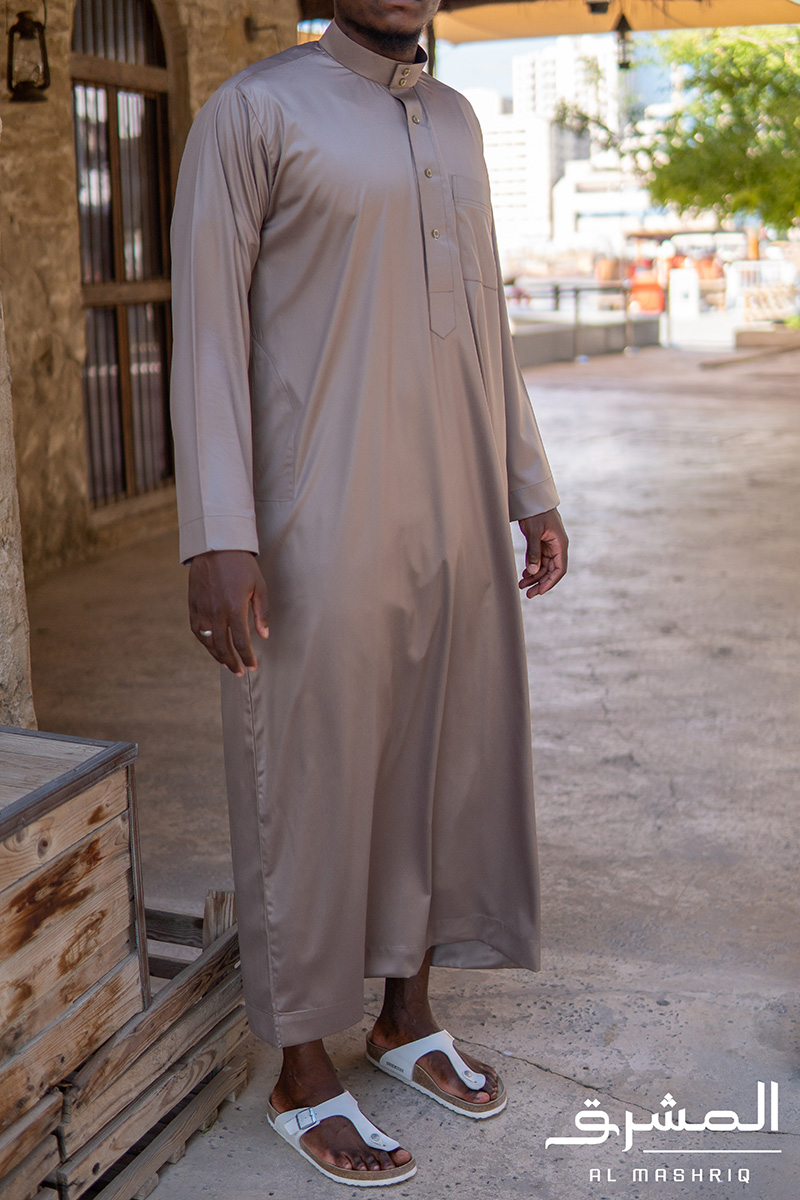 Qamis confectionné aux émirats arabes unis avec un tissu vietnamien precious satiné sans boutons aux manches